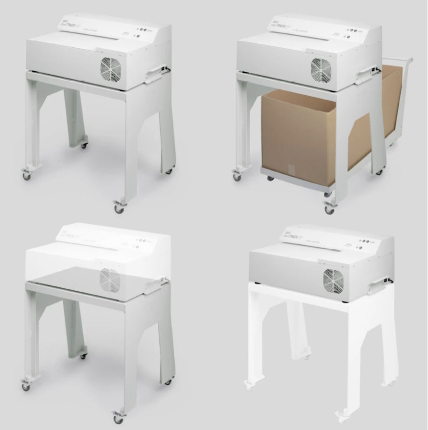 Do nacinarki chartiPACK CP możesz dokupić stojak idealnie dopasowany do wagi i rozmiaru nacinarki. Stojak jest na kółkach z opcją blokady, więc bez problemu postawisz go w każdym miejscu, a w razie potrzeby łatwo przemieścisz do innego pomieszczenia. Kolejnym akcesorium dostępnym do naszej nacinarki jest wózek na kółkach, również z opcją blokady. Wózek posiada wygodny uchwyt i idealnie mieści się pomiędzy nogami stojaka. Wózek dedykowany jest dla kartonowego pudła, do którego trafiają gotowe wypełniacze. Ostatnim z dostępnych akcesoriów jest adapter do podpięcia odpylacza lub odkurzacza. Adapter posiada gniazdo o średnicy 37 mm.