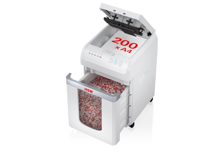 Niszczarka z automatycznym podajnikiem niszcząca do 200 arkuszy na ścinki o poziomie bezpieczeństwa P-4 (4 x 12 mm) gwarantuje bezpieczeństwo danych zgodne z wymogami RODO.