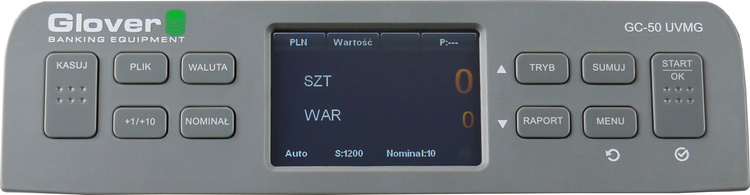 Glover GC-50UV/MG to innowacyjne i przyjazne użytkownikom urządzenie do liczenia banknotów. Jako jedno z niewielu na rynku, komunikuje się w pełni w języku polskim za pomocą wbudowanego panelu LCD. Ten model liczarki do banknotów został wyposażony w szereg unikatowych rozwiązań. Pozwalają one na efektywne korzystanie z jej rozbudowanych funkcji w prosty sposób. Stosunkowo niewielkie wymiary gwarantują natomiast możliwość komfortowego korzystania z niej w trakcie codziennej pracy.